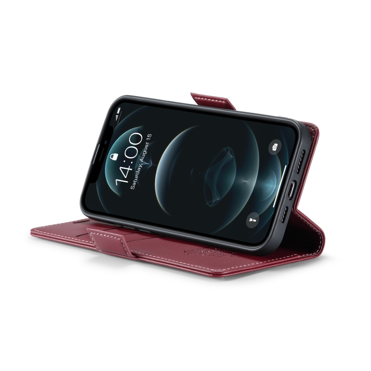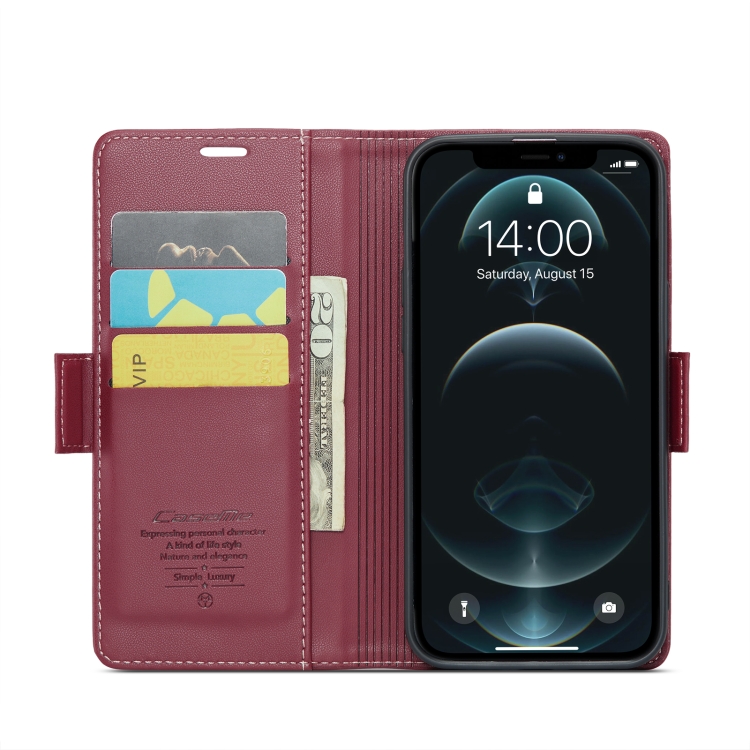 Funda para iPhone 12 Mini Caseme 023 Mariposa Hebilla Litchi Textura Rfid Cuero Antirrobo (Rojo Vino)