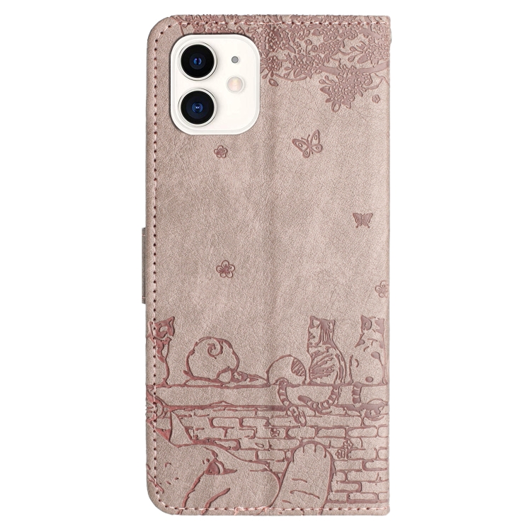 Funda de teléfono iPhone 12 Mini Cat cuero patrón relieve con cordón (Gris)