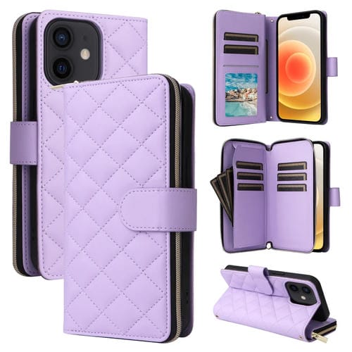 Estuche para teléfono iPhone 12 Mini de cuero con hebilla de torre y cremallera rómbica cruzada con cordón (Púrpura)