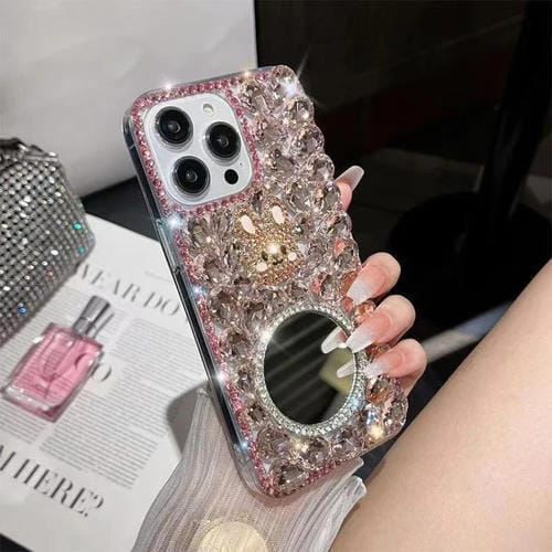 For iPhone 12 Pro Diamond Mirror Bunny Handmade PC Phone Case(Pink Round Mirror)