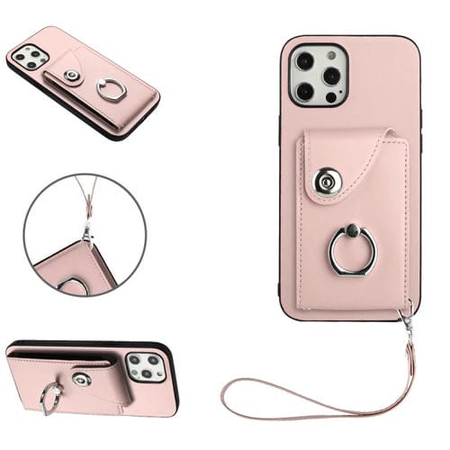 Funda para teléfono iPhone 12 Pro PU con soporte para anillo y bolsa para tarjeta con cordón (Rosa)