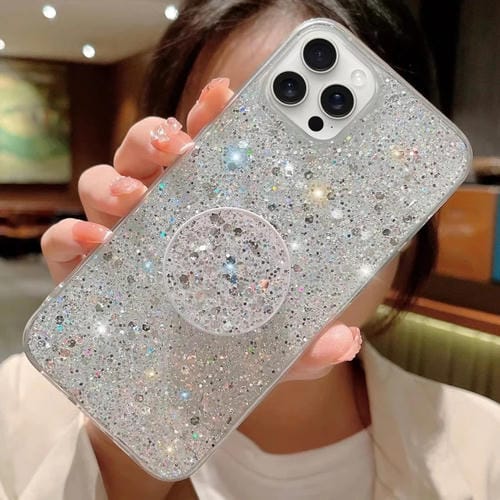 Funda para Teléfono TPU Epoxi iPhone 12 Pro con Soporte Redondo y Lentejuelas Estrelladas (Plateado)
