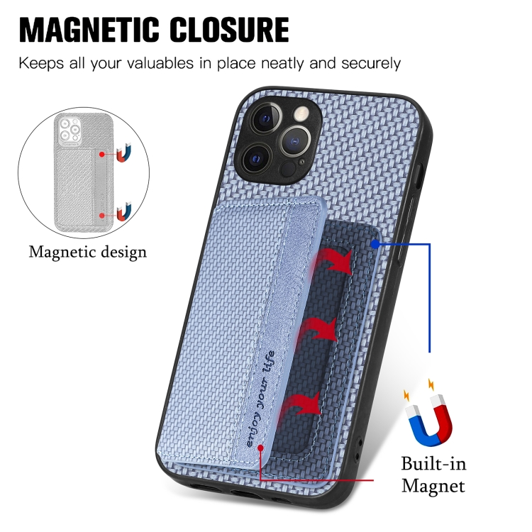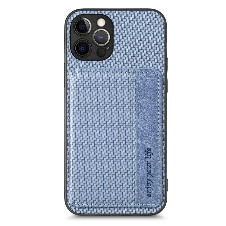 Funda de teléfono para iPhone 12 Pro Max con bolsa de tarjeta magnética de fibra de carbono (Azul)