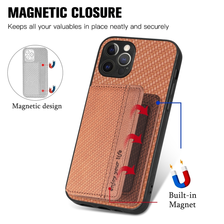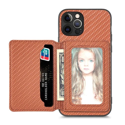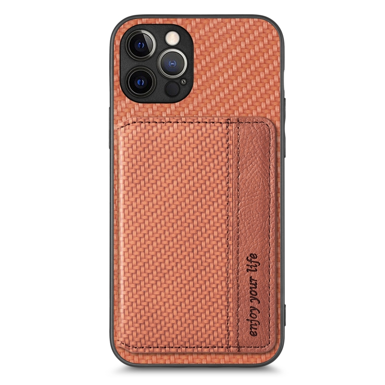 Funda de Teléfono para iPhone 12 Pro Max Bolsa de Tarjeta Magnética Fibra de Carbono (Marrón)