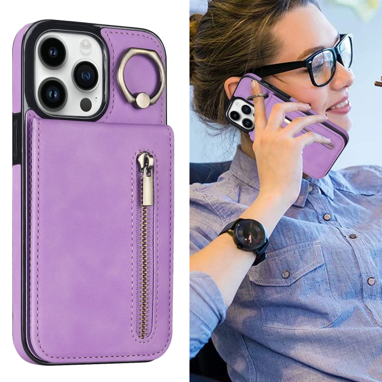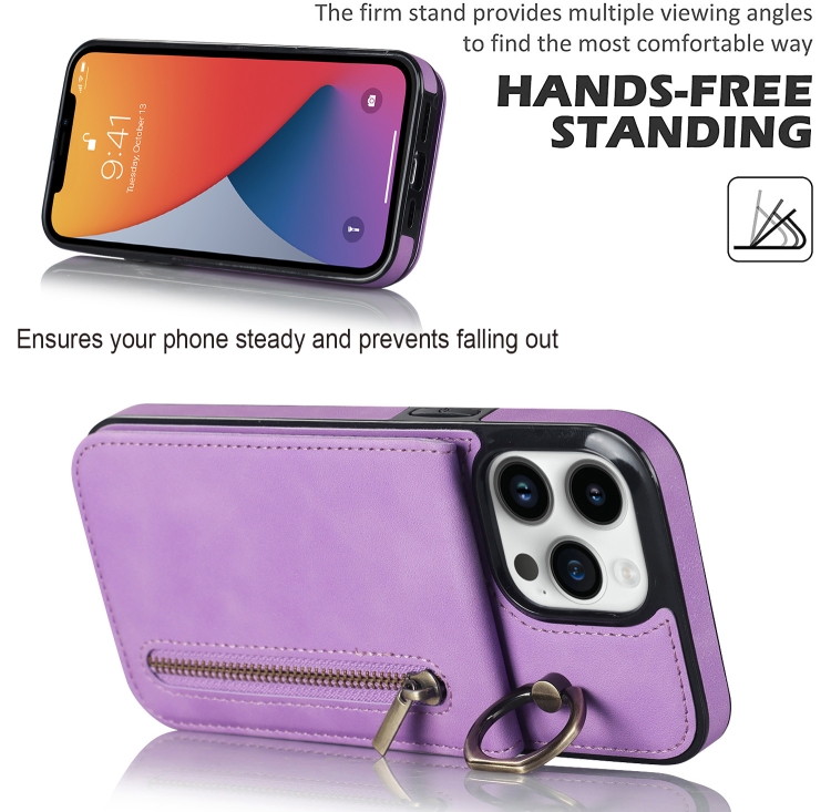 Funda para iPhone 12 Pro Max Retro Ring y Zipper con Ranura Rfid para Tarjeta (Púrpura)