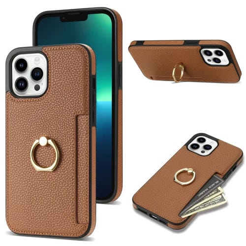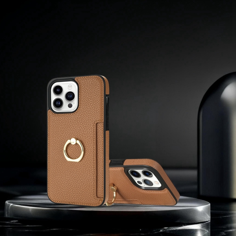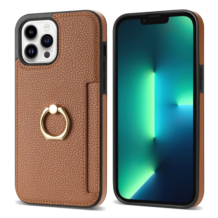 Funda Trasera iPhone 12 Pro Ring Card Litchi Cuero (Marrón)