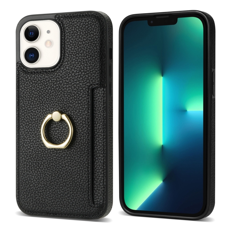 Funda Trasera para iPhone 12 Ring Card Litchi Cuero (Negro)