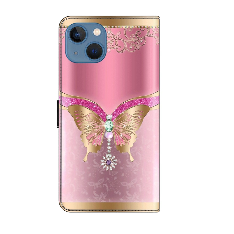 Funda Protectora de Cuero para iPhone 13/14 Crystal 3D a Prueba de Golpes (Mariposa Inferior Rosa)