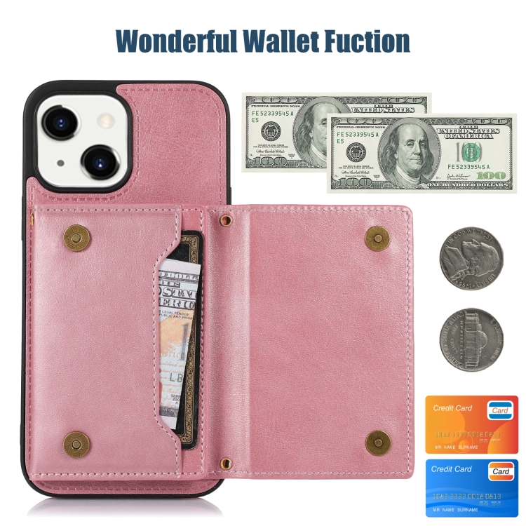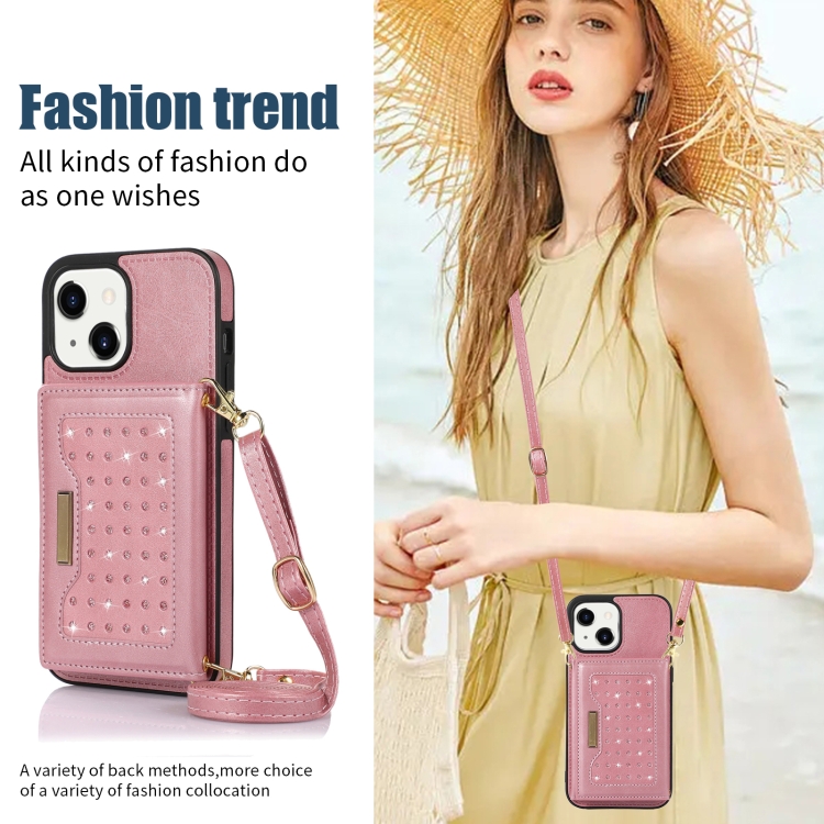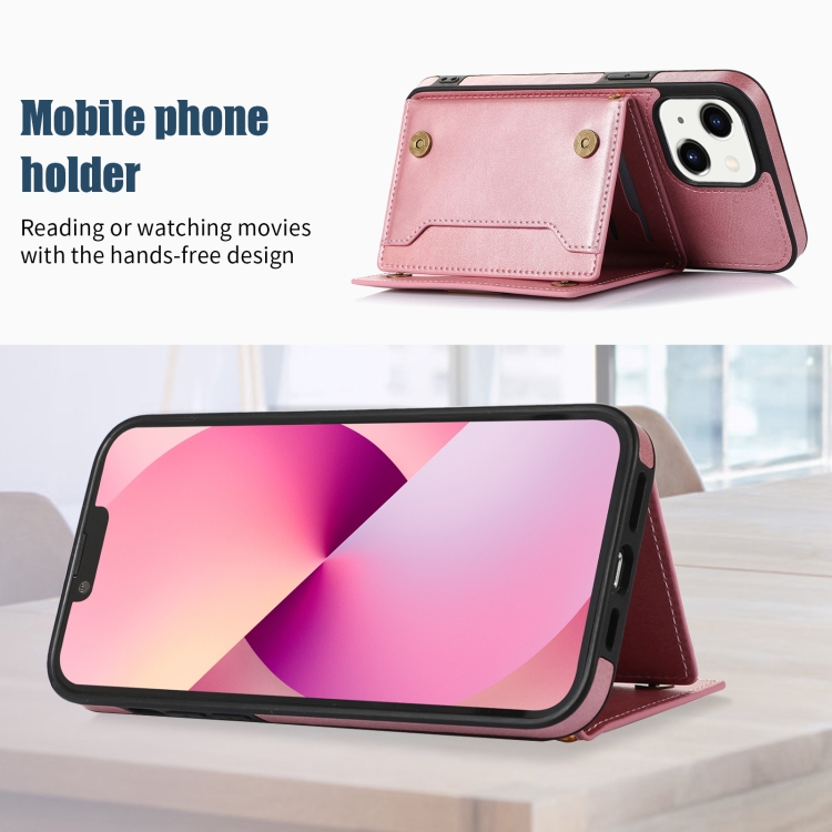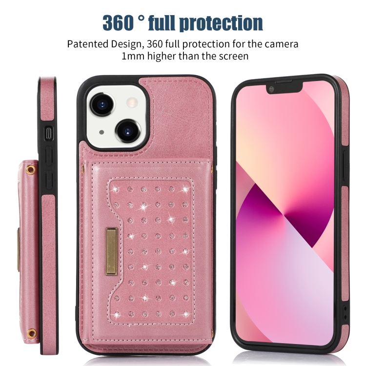 Estuche de Teléfono para iPhone 13 Cuero Rfid Tres Pliegues con Cordón (Oro Rosa)