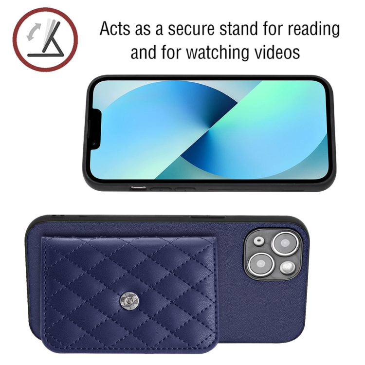 For iPhone 13 RFID Phone Case with Rhombic Texture Card Bag and Long Lanyard (Dark Purple)