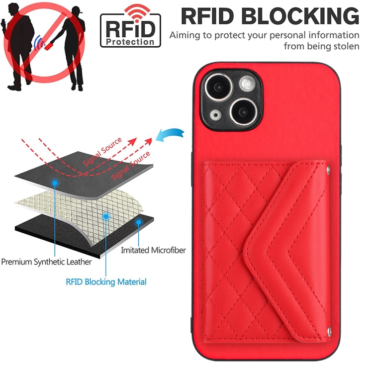 For iPhone 13 RFID Phone Case with Rhombic Texture Card Bag and Long Lanyard (Red)