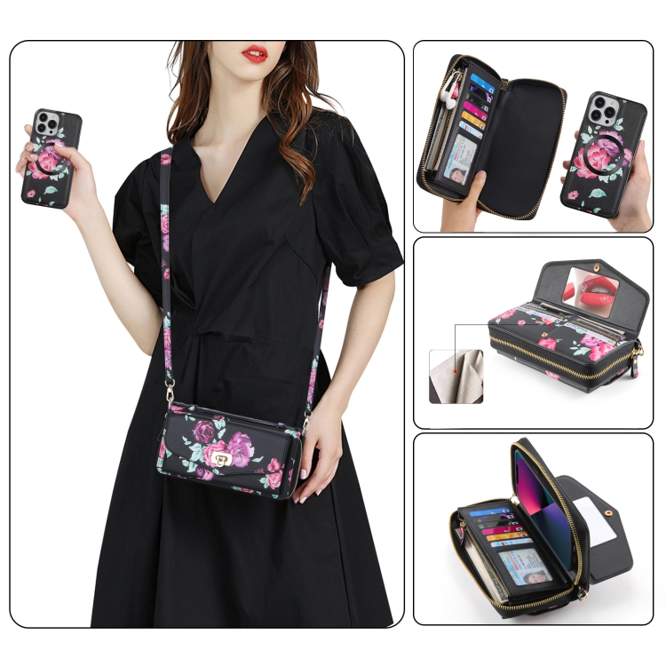 For iPhone 13 Leather Phone Case with MagSafe Flower Multifunctional Crossbody Zipper Wallet (Black)