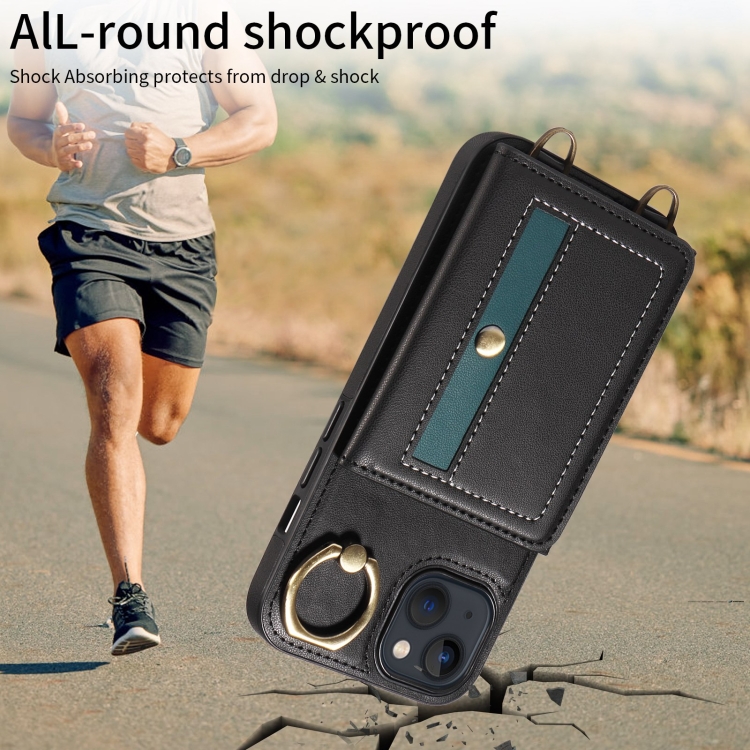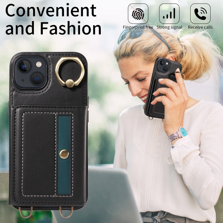 Funda para Teléfono iPhone 13 Cuero con Soporte para Anillo y Bolso Cruzado para Tarjetas (Negro)
