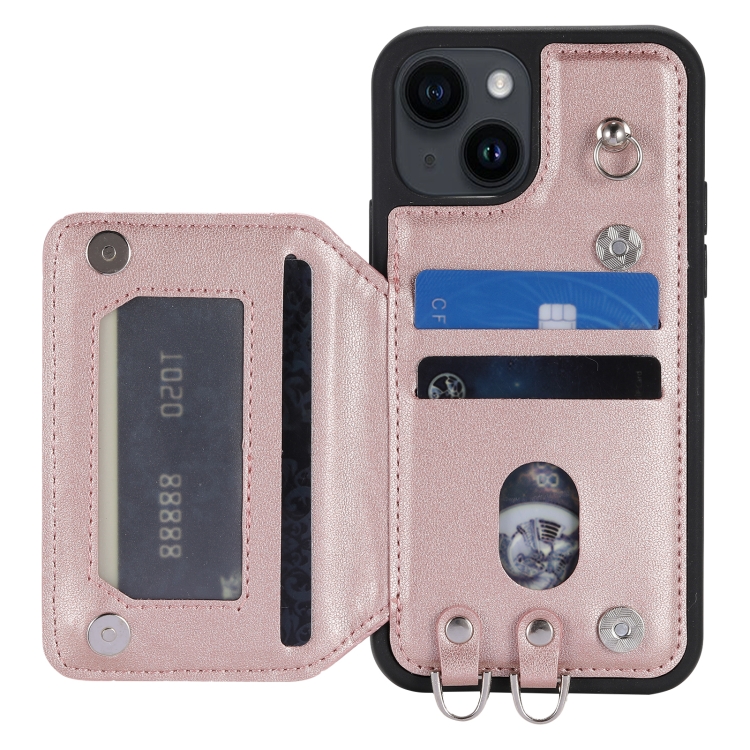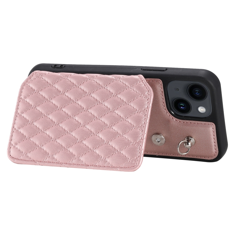 For iPhone 13 Phone Case with Grid Texture Card Holder and Lanyard (Rose Gold)