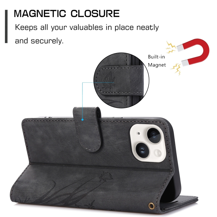 For iPhone 13 Orchid Butterfly Embossed Leather Phone Case (Black)