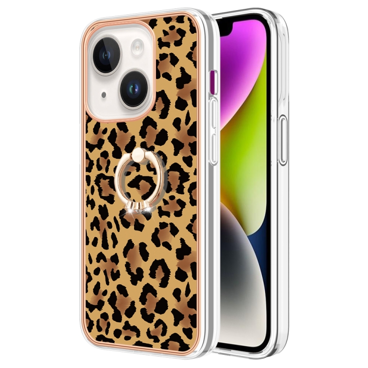 For iPhone 13 Electroplating Double-sided IMD Phone Case with Ring Holder (Leopard Print)