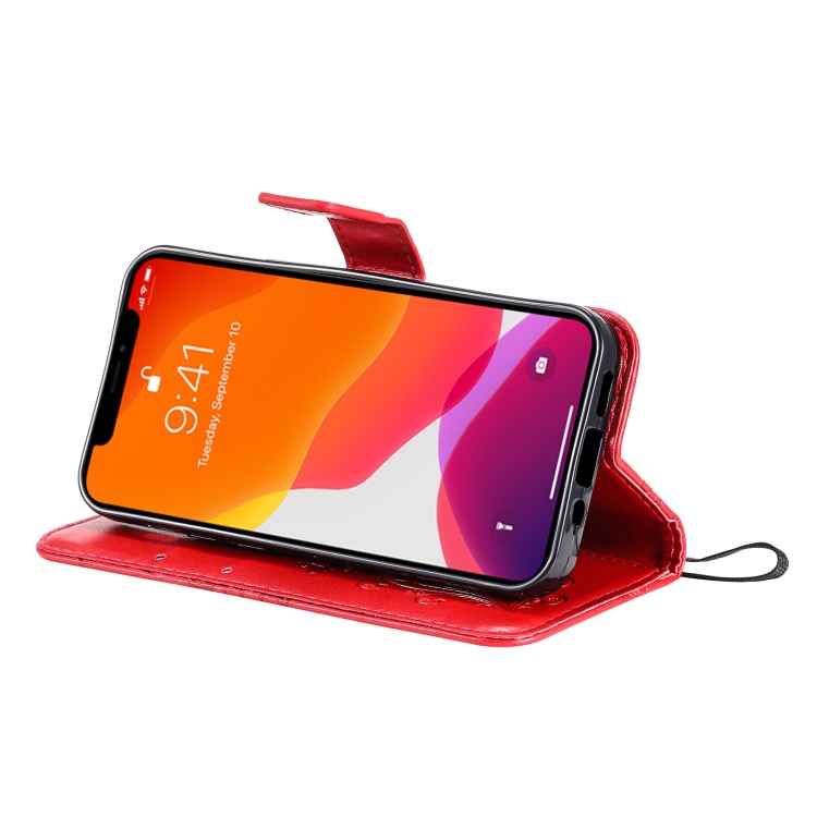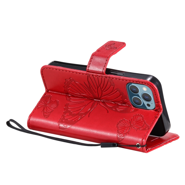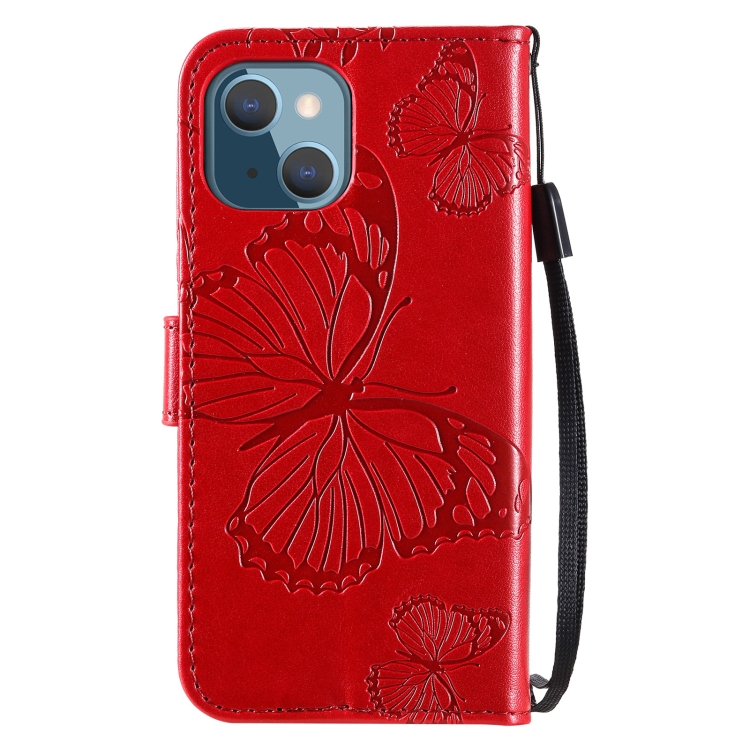 Funda de cuero iPhone 13 Mini 3D Patrón Mariposa con tapa, soporte, ranura para tarjeta, billetera y cordón (Rojo)