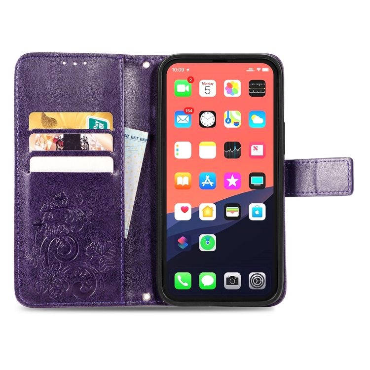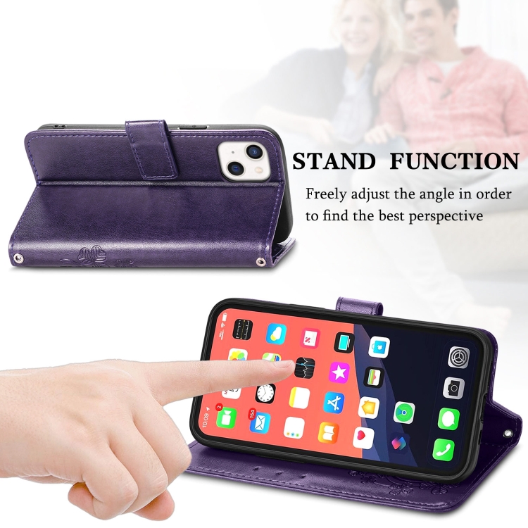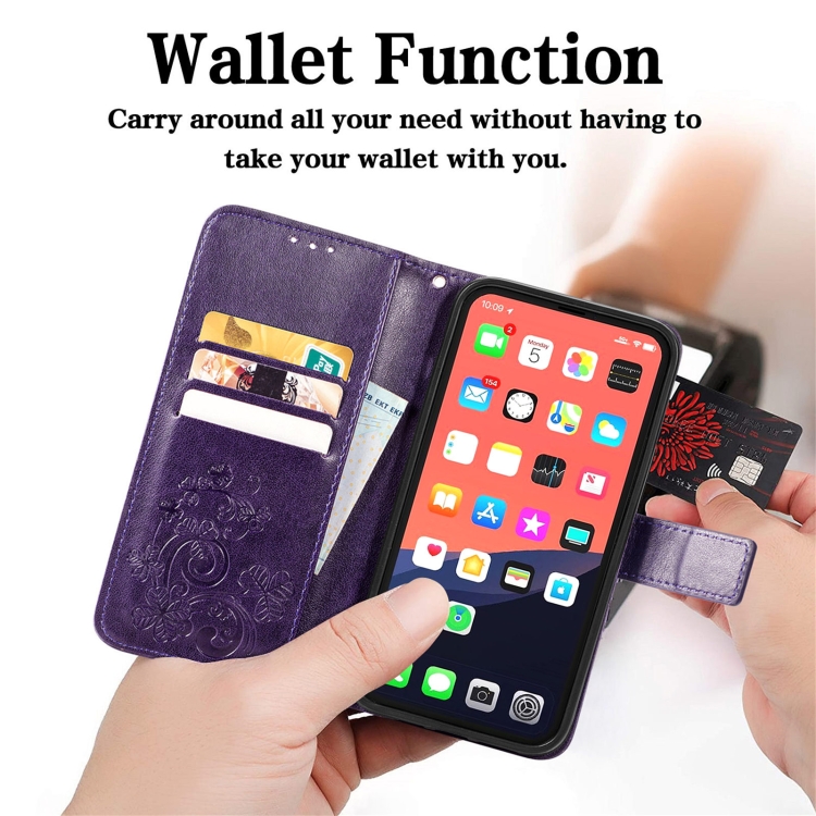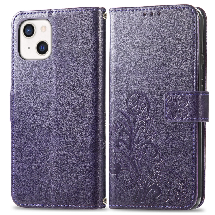 Funda de cuero para iPhone 13 Mini con cierre trébol hebilla en relieve y ranura para tarjeta monedero soporte (Púrpura)