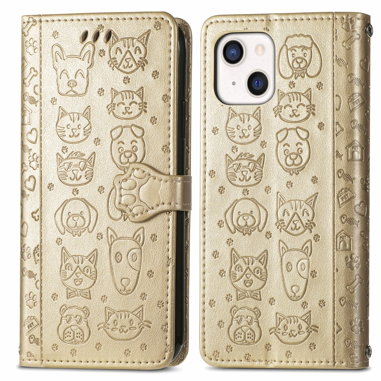 Estuche de Cuero iPhone 13 Mini Cute Cat And Dog Tapa Horizontal Soporte Ranuras Billetera Cordón (Dorado)