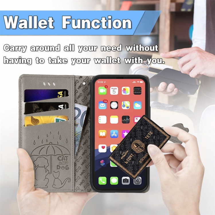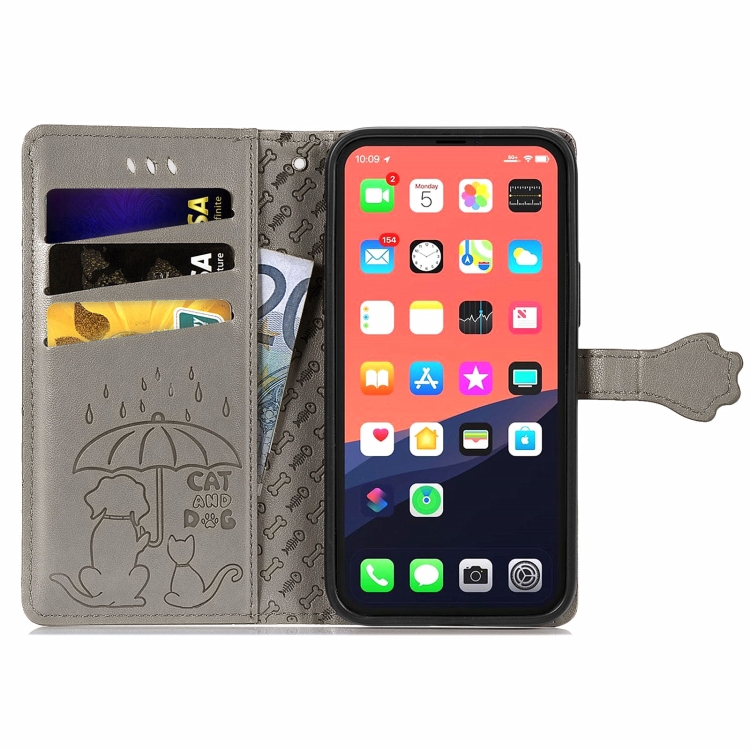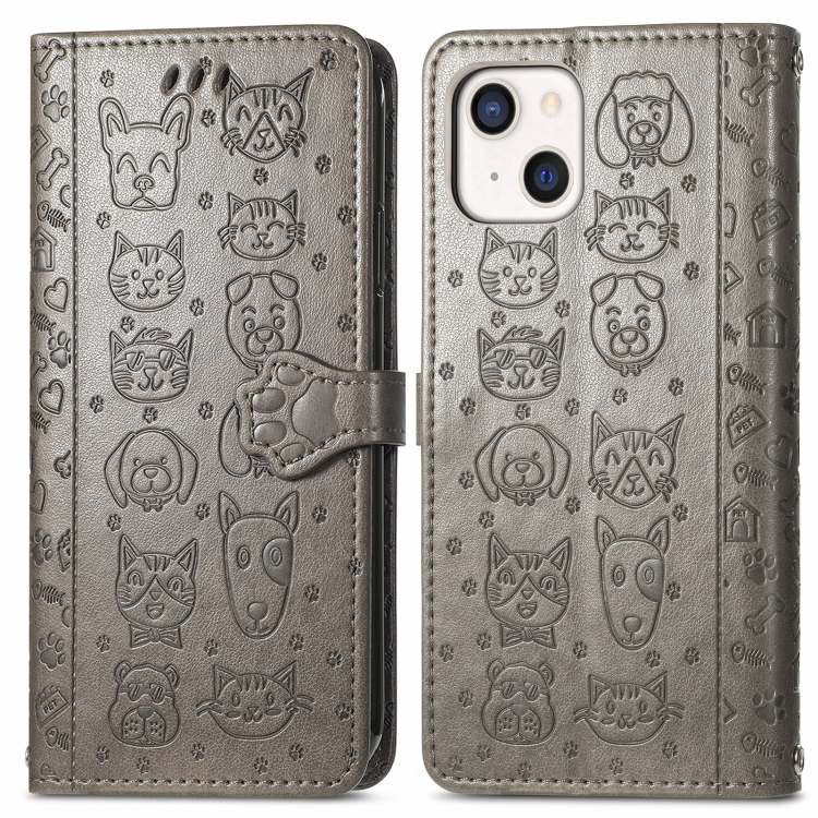 Estuche de Cuero para iPhone 13 Mini Cute Cat And Dog con Tapa Horizontal En Relieve Soporte Ranuras Tarjetas Billetera Cordón (Gris)