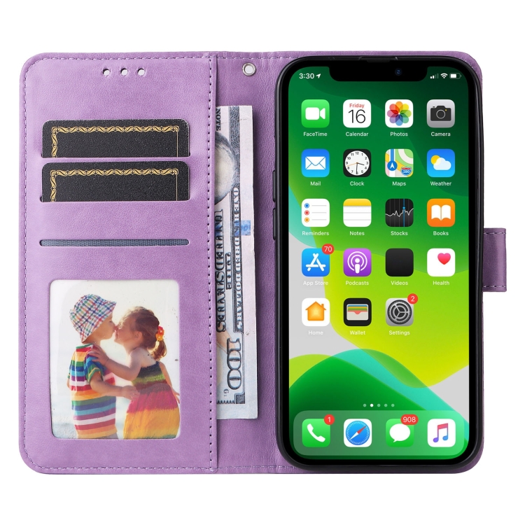Estuche para teléfono iPhone 13 Mini cuero con estampado de girasol en relieve (Púrpura)