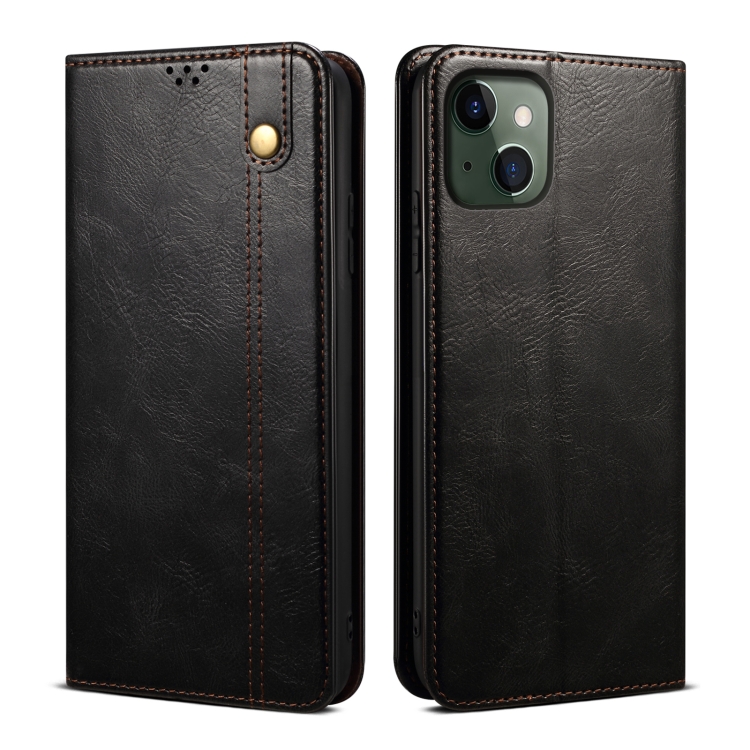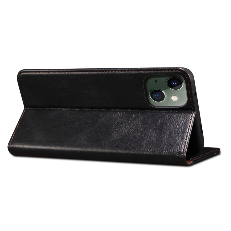 Funda de Cuero para iPhone 13 Mini con Tapa Horizontal Textura Caballo Loco y Ranuras para Tarjetas (Negro)