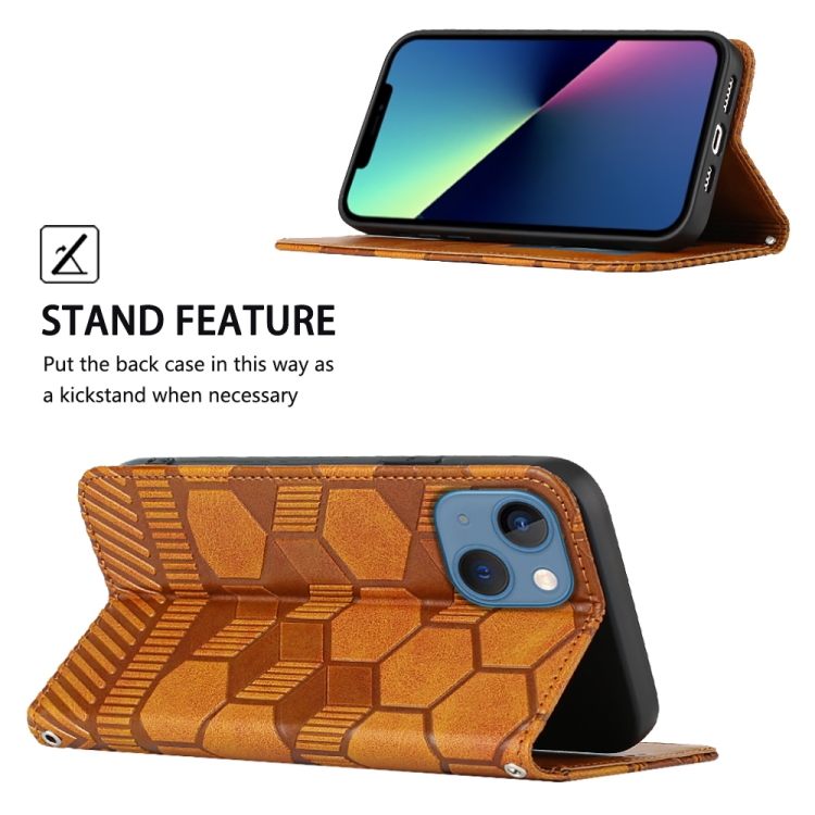 Funda de teléfono iPhone 13 Mini con tapa de cuero magnético y textura de fútbol (Caqui)