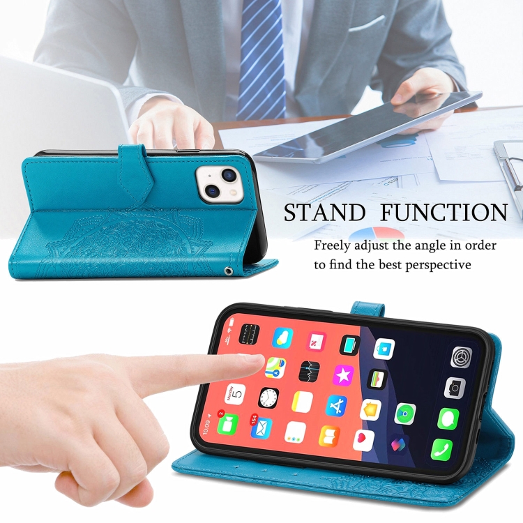 Estuche de Cuero Mandala Flower para iPhone 13 Mini con Tapa Horizontal en Relieve Soporte y Ranuras para Tarjetas (Azul)