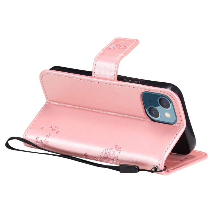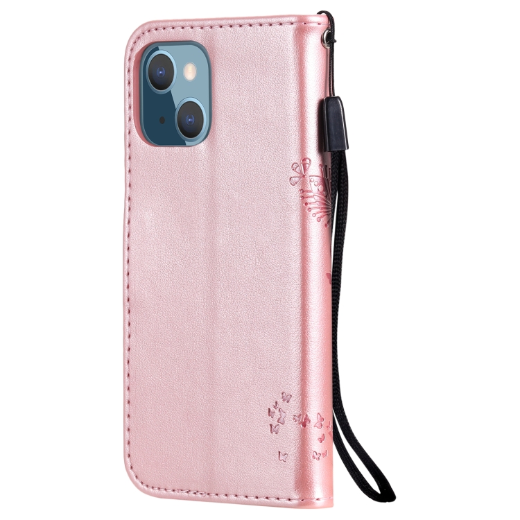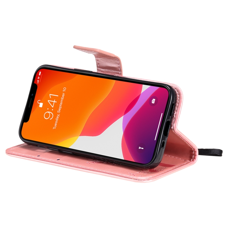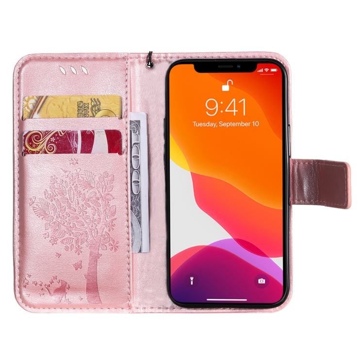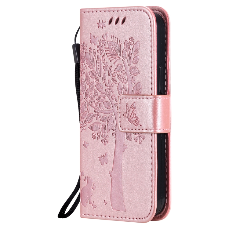 Funda para iPhone 13 Mini Cuero de PU con Patrón de Árbol y Gato, Tapa Horizontal, Soporte, Ranuras para Tarjetas y Cordón (Oro Rosa)