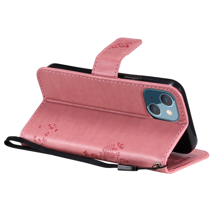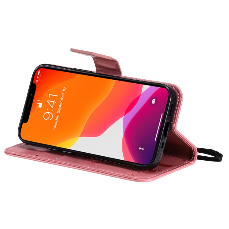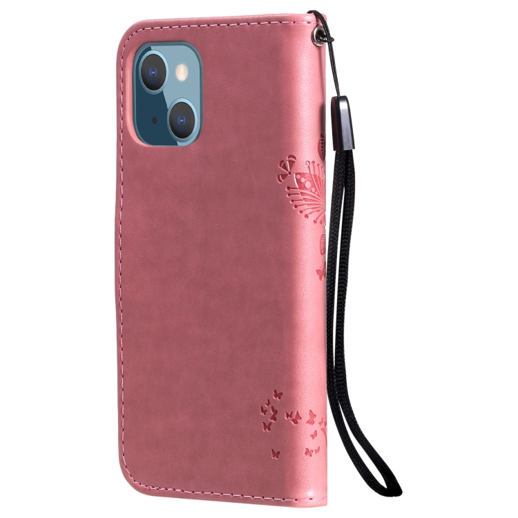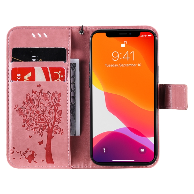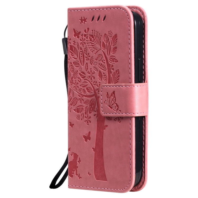 Funda de Cuero de PU para iPhone 13 Mini con Patrón Árbol y Gato, Tapa Horizontal, Soporte, Ranuras para Tarjetas y Billetera (Rosa)