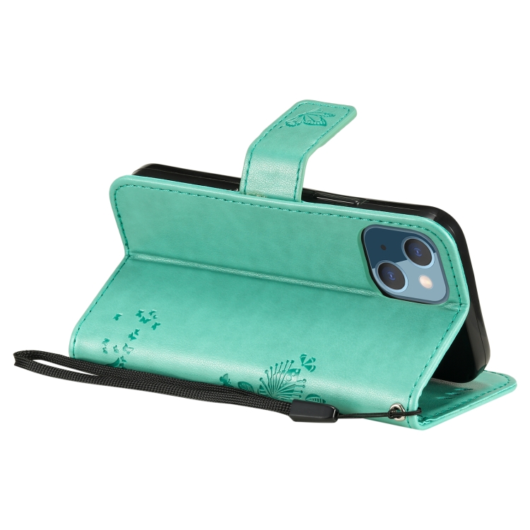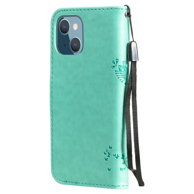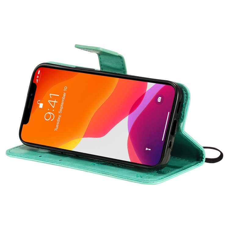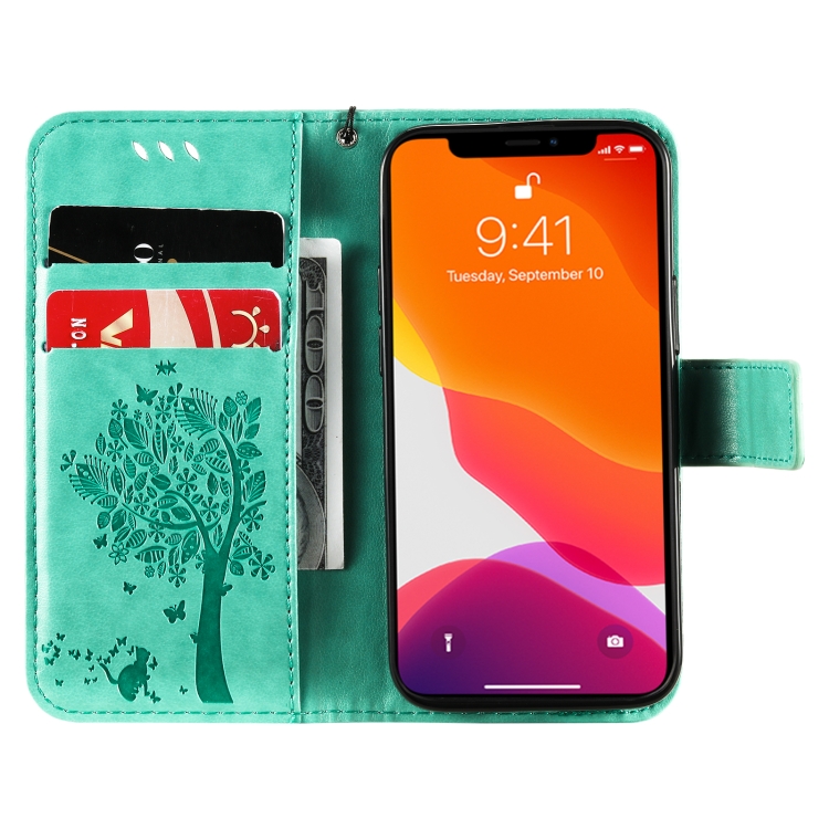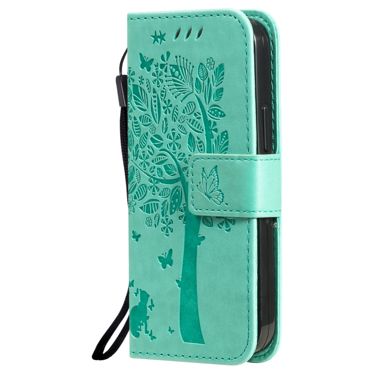 Funda para iPhone 13 Mini Cuero de PU Patrón Árbol y Gato con Tapa Horizontal Soporte Ranuras Tarjetas Billetera Cordón (Verde)