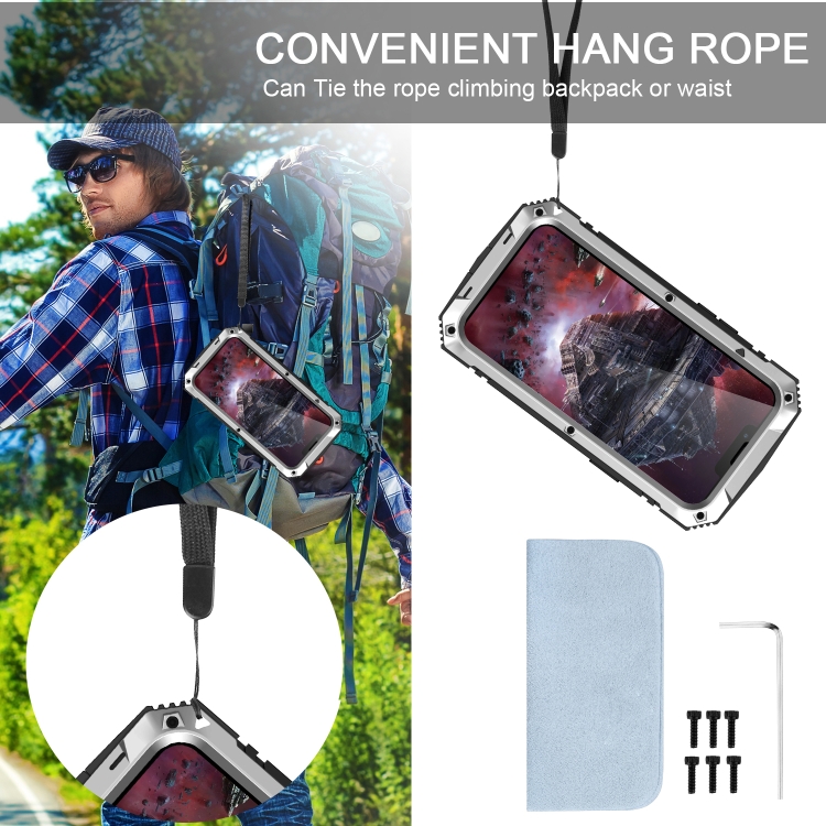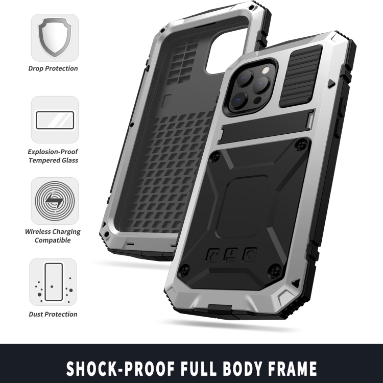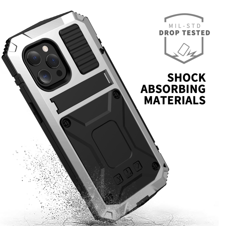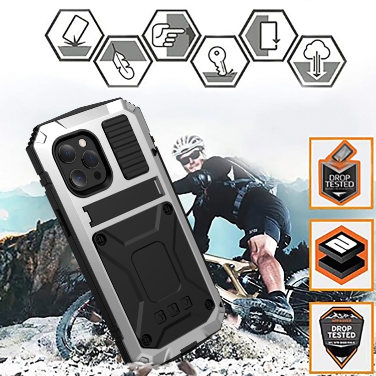 Funda para iPhone 13 Mini R-Just a Prueba de Golpes Agua Polvo Metal + Silicona con Soporte (Plata)