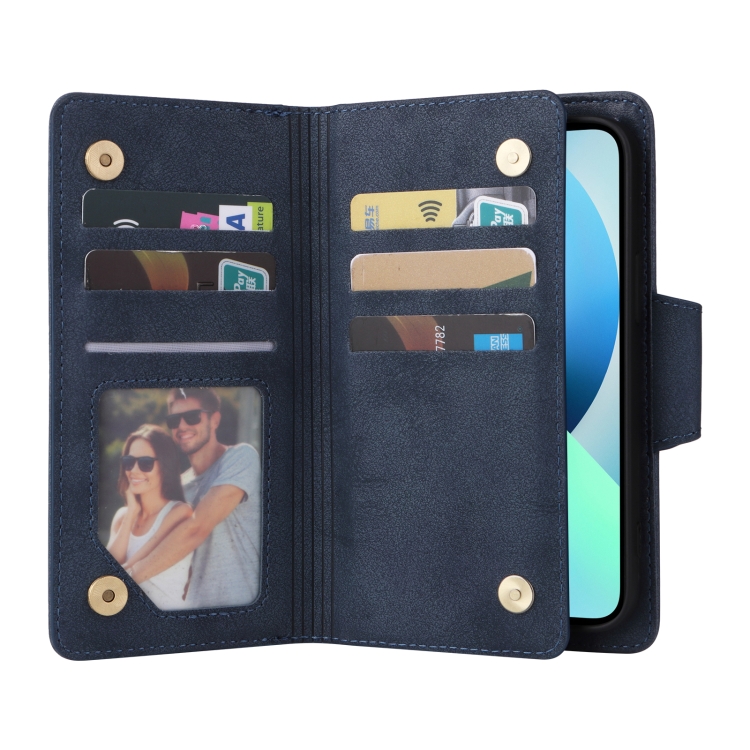 Funda de Cuero para iPhone 13 Mini Rivet Buckle 9 Cards Tres Pliegues (Azul)