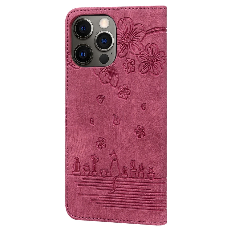 Estuche para iPhone 13 Pro Cartoon Sakura Cat Cuero En Relieve (Vino Rojo)