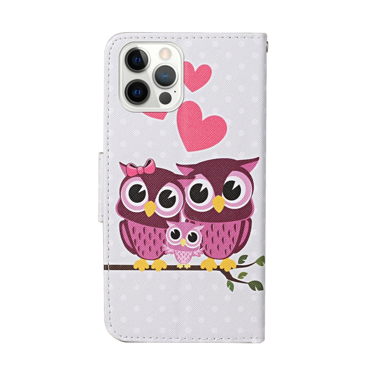 Estuche de Cuero para iPhone 13 Pro con Tapa y Patrón de Dibujo Coloreado (Familia de Búhos)