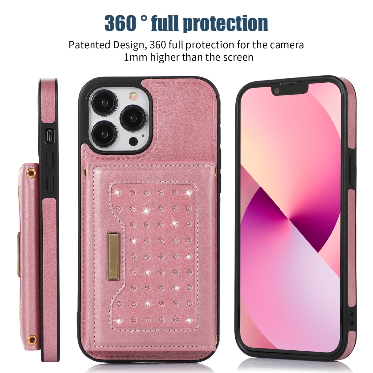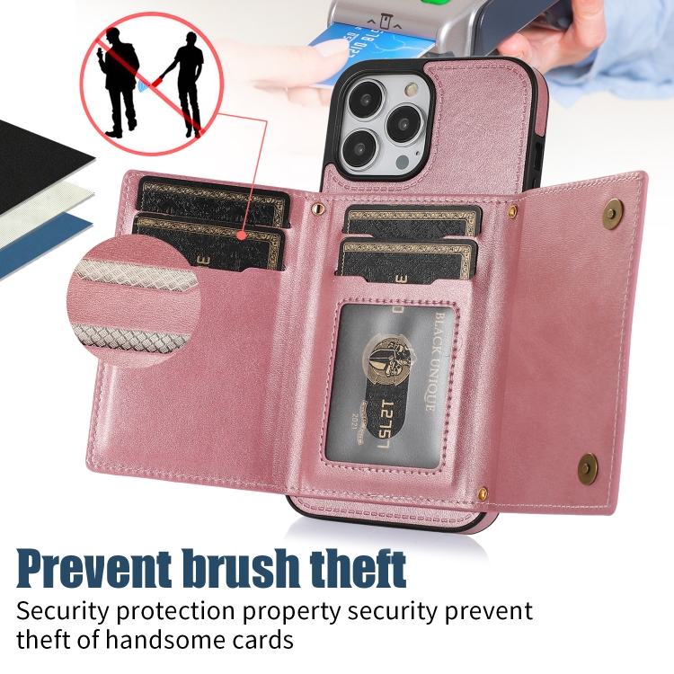 For iPhone 13 Pro Tri-fold RFID Leather Phone Case with Lanyard (Rose Gold)