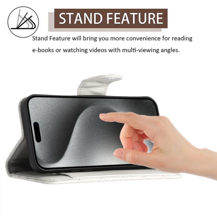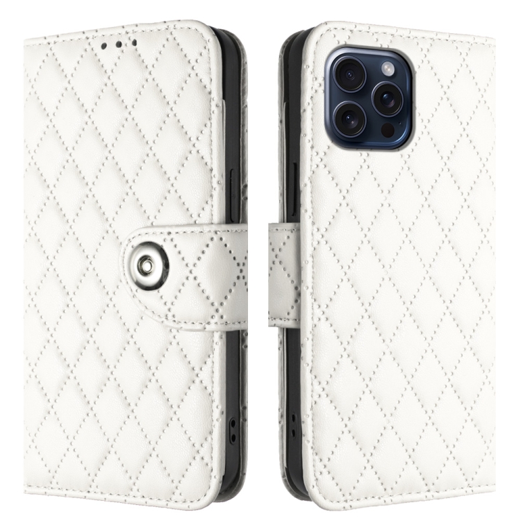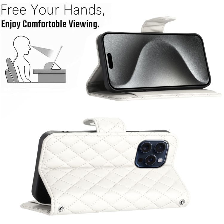Funda de Cuero para iPhone 13 Pro con Tapa Textura Rómbica y Cordón (Blanco)
