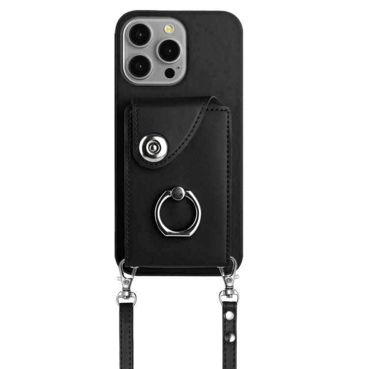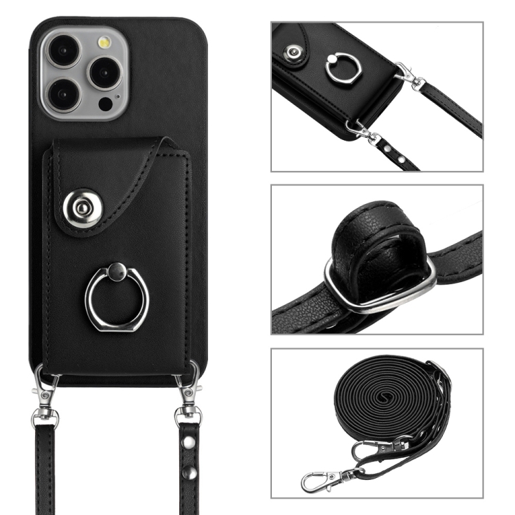 Funda para Teléfono iPhone 13 Pro con Soporte para Anillo y Bolsa para Tarjeta con Cordón Largo (Negro)