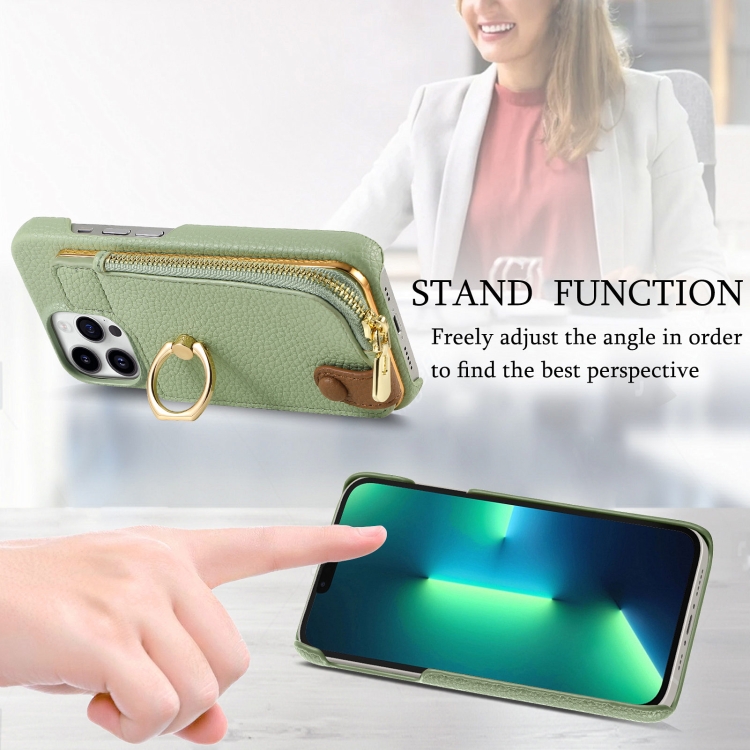 Funda Trasera para iPhone 13 Pro con Billetera con Cremallera y Anillo en Cuero Litchi (Verde Té)