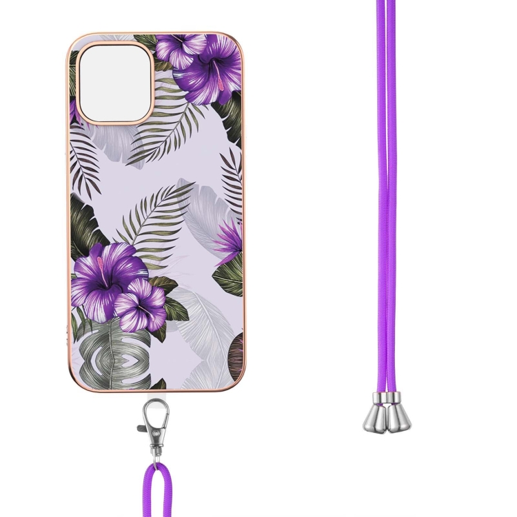 Estuche TPU para iPhone 13 Pro Galvanoplastia Patrón Imd a Prueba de Golpes con Cordón (Flor Púrpura)
