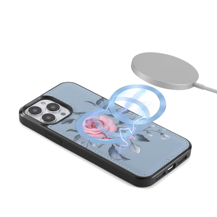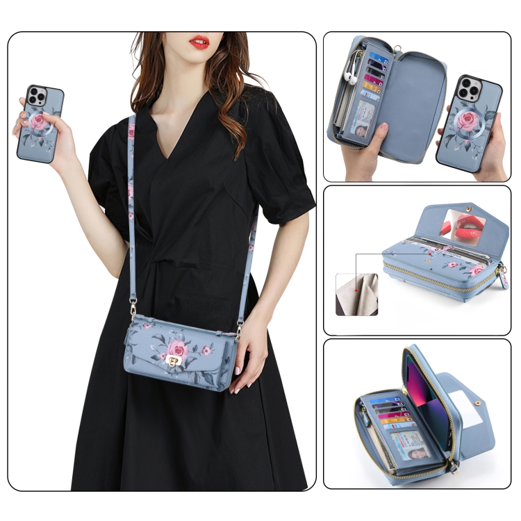 For iPhone 13 Pro MagSafe Flower Leather Phone Case Multifunctional Zipper Crossbody Wallet Case (Blue)