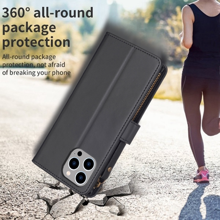 Funda Cartera para iPhone 13 Pro Max 9 Ranuras para Tarjetas Cremallera Cuero con Tapa (Negro)