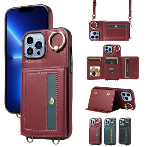 Funda para Teléfono iPhone 13 Pro Max Cuero con Soporte para Anillo y Bolso Cruzado para Tarjetas (Rojo)