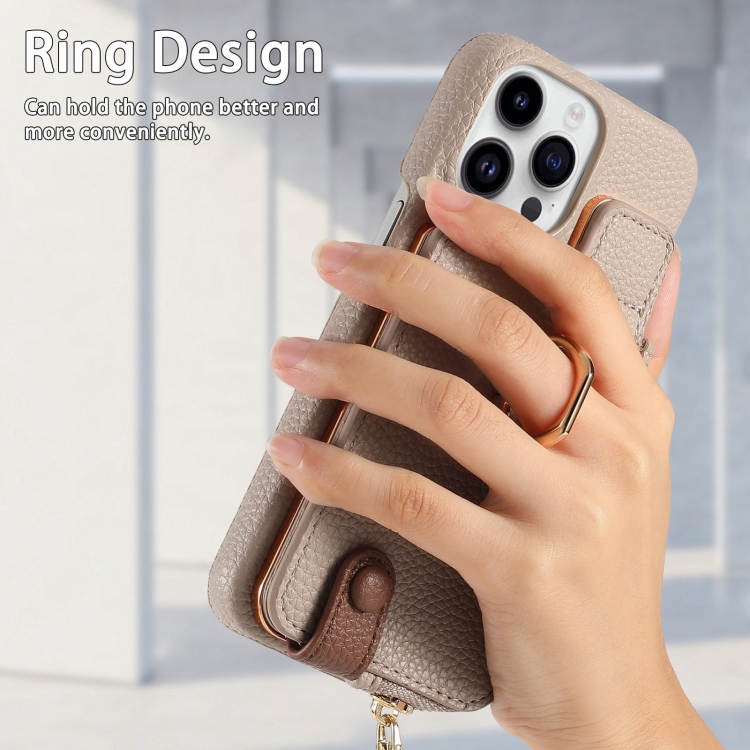 Funda Trasera para iPhone 13 Pro Max con Billetera, Cremallera y Anillo de Cuero Litchi (Caqui)