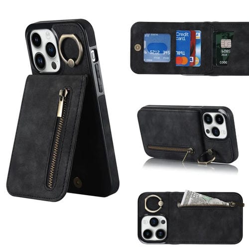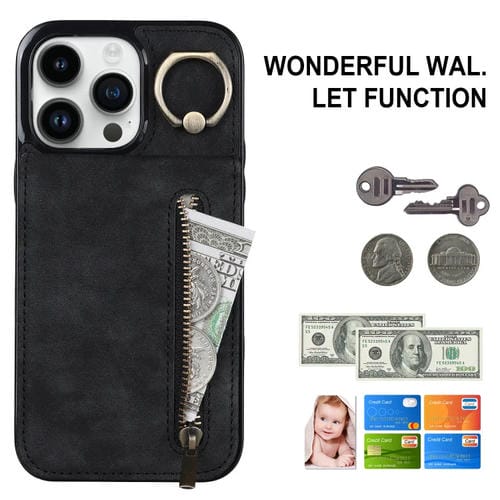 Funda para iPhone 13 Pro Max Retro Ring y Zipper Rfid Card Slot (Negro)