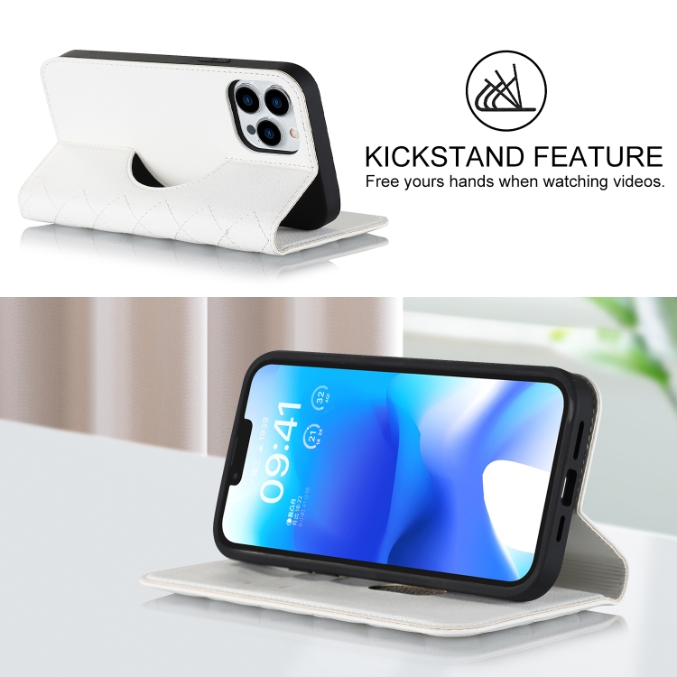 Funda para iPhone 13 Pro Max Rhombic Magsafe Rfid Antirrobo Cuero con Billetera (Blanco)