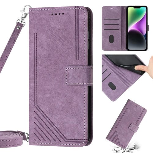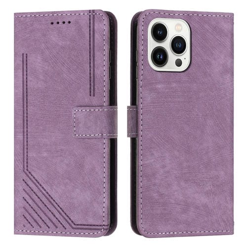 Funda de Cuero para Teléfono iPhone 13 Pro Max Skin Feel Stripe Pattern con Cordón (Púrpura)