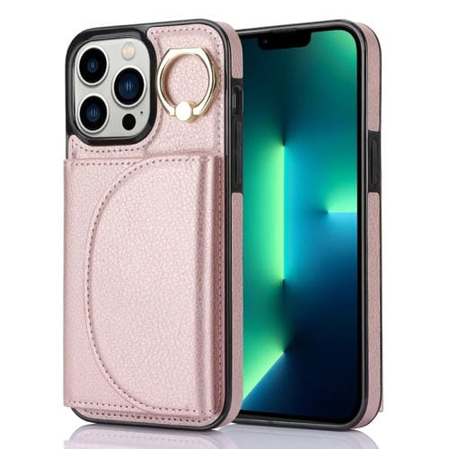 Estuche para teléfono Ym006 para iPhone 13 Pro Max con soporte para anillo y tarjeta con sensación de piel (Oro Rosa)
