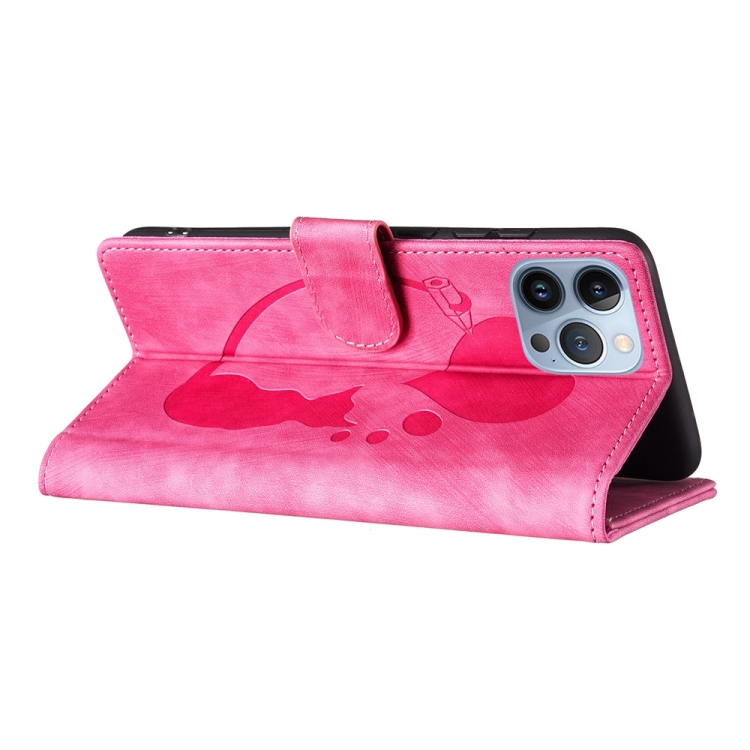Funda de Cuero para iPhone 13 Pro Pen Heart Cat en Relieve (Rosa)