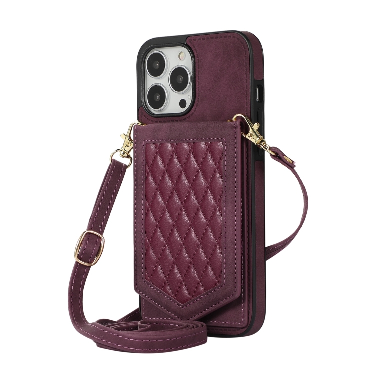 Funda para iPhone 13 Pro Rhombic Texture Rfid con Cordón y Espejo (Rojo Vino)
